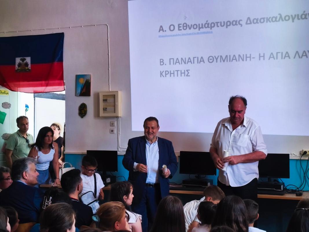 Παράλληλα, είμαστε ιδιαίτερα υπερήφανοι που δύο σχολεία μας, το Δημοτικό Σχολείο Καστελλίου και το Δημοτικό Σχολείο Ανώπολης Σφακίων, ένωσαν τις δυνάμεις τους για να υλοποιήσουν ένα τόσο σημαντικό εκπαιδευτικό πρόγραμμα, εμβαθύνοντας στην ιστορία της Κρήτης και στους αγώνες των προγόνων μας για την ελευθερία. Τα φωτεινά παραδείγματα του Δασκαλογιάννη και του Τρυφίτσου αποτελούν πολύτιμη κληρονομιά, διδάσκοντας μας την αξία της ενότητας και της αποφασιστικότητας. Συγχαίρω θερμά τους μαθητές και τους εκπαιδευτικούς για αυτές τις αξιέπαινες πρωτοβουλίες. Η ευαισθησία και η προσήλωσή σας στην ιστορική αλήθεια αποτελούν πηγή ελπίδας για το μέλλον Οι εκδηλώσεις αναδεικνύουν τη σημασία της διατήρησης της ιστορικής μνήμης και την ανάγκη μετάδοσης των αξιών της ειρήνης, της ελευθερίας και της αξιοπρέπειας, στις νέες γενιές».