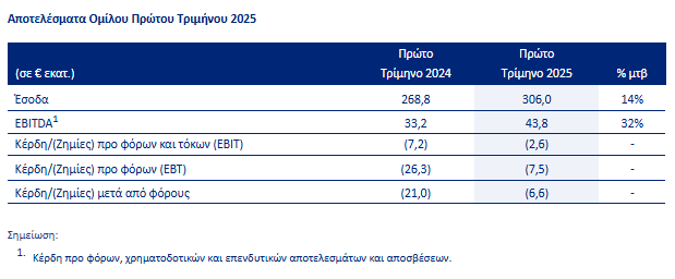 Ο κύκλος εργασιών του Ομίλου ανήλθε σε €306,0 εκατ., αυξημένος κατά 14% σε σύγκριση με το πρώτο τρίμηνο του 2024. Η ισχυρή δυναμική της ζήτησης συνέβαλε στη βελτίωση των Κερδών προ Φόρων, Τόκων και Αποσβέσεων (EBITDA) τα οποία ανήλθαν σε €43,8 εκατ., σημειώνοντας αύξηση 32% και καταγράφοντας την υψηλότερη επίδοση EBITDA που έχει επιτύχει η AEGEAN σε πρώτο τρίμηνο στην ιστορία της.