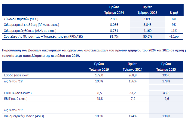 «Το πρώτο τρίμηνο του 2025 επιβεβαιώνει τη δυναμική πορεία των μεγεθών μας σύμφωνα με τις στρατηγικές κατευθύνσεις μας. Ενισχύσαμε περαιτέρω την επιβατική μας κίνηση, ιδιαίτερα στο εξωτερικό, πετώντας μάλιστα για δεύτερη χρονιά σε κάποιους συγκεκριμένους προορισμούς περισσότερο το χειμώνα από το καλοκαίρι, βελτιώσαμε σημαντικά τα λειτουργικά αποτελέσματα, καταγράφοντας την υψηλότερη επίδοση EBITDA στην ιστορία μας ενώ περιορίστηκαν αισθητά οι ζημιές στο εποχικά ασθενέστερο τρίμηνο του έτους.
