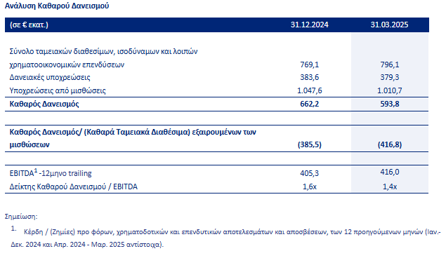 Η AEGEAN διατήρησε ισχυρή ρευστότητα με συνολικά διαθέσιμα, ισοδύναμα και λοιπές χρηματοοικονομικές επενδύσεις που διαμορφώθηκαν στα €796,1 εκατ. την 31.03.2025, μετά και την παραλαβή ενός νέου αεροσκάφους Α320neo που χρηματοδοτήθηκε με ίδια διαθέσιμα τον Μάρτιο 2025.