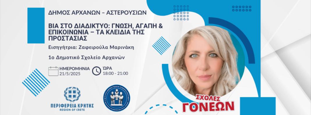 Στον Δήμο Αρχανών – Αστερουσίων, η συνάντηση θα έχει θέμα «Βία στο Διαδίκτυο: Γνώση, Αγάπη & Επικοινωνία – Τα Κλειδιά της Προστασίας» και θα πραγματοποιηθεί στο 1ο Δημοτικό Σχολείο Αρχανών, από τις 18:00 έως τις 21:00. Εισηγήτρια της συγκεκριμένης συνάντησης θα είναι η κα. Ζαφειρούλα Μαρινάκη, Κοινωνική Λειτουργός με μεταπτυχιακές σπουδές στην Εκπαίδευση Ενηλίκων, η οποία θα μοιραστεί με τους γονείς διορατικές στρατηγικές για την ενίσχυση της οικογένειας απέναντι στους κινδύνους του διαδικτύου, αναδεικνύοντας τη σημασία της γνώσης και της αγάπης ως θεμέλια για τη δημιουργία ενός ασφαλούς και υποστηρικτικού περιβάλλοντος.