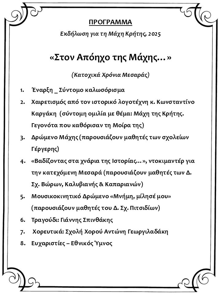 Ο Δήμος Φαιστού και η Τοπική Κοινότητα Μοιρών, σε συνδιοργάνωση με την Περιφέρεια Κρήτης και με συνεργασία σχολείων της περιοχής, Βώρων, Γέργερης, Καπαριανών, Καλυβιανής και Πιτσιδίων, τιμά την 84η Επέτειο της Μάχης της Κρήτης με μια ξεχωριστή σχολική εκδήλωση με τίτλο: «Στον απόηχο της Μάχης…» – Κατοχικά Χρόνια Μεσαράς