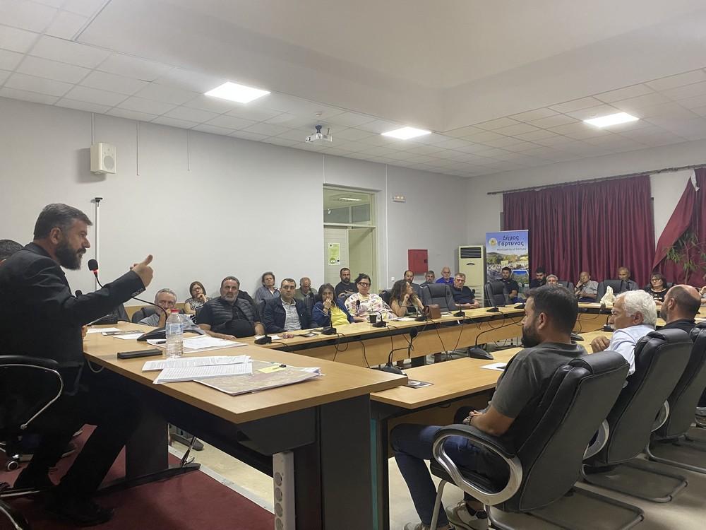 Στο πλαίσιο της ενημερωτικής συνάντησης, οι πρόεδροι των κοινοτήτων του Δήμου Γόρτυνας παρέλαβαν έντυπο υλικό – χάρτες, στους οποίους αποτυπώνονται (κατ’ εκτίμηση) οι αλλαγές που επιφέρει το Π.Δ. στα όρια των οικισμών. Υπενθυμίζεται ότι το Δημοτικό Συμβούλιο του Δήμου Γόρτυνας, με ομόφωνο ψήφισμά του, έχει ήδη καταδικάσει το περιεχόμενό του Π.Δ., επισημαίνοντας ότι δεν εξυπηρετεί τις ανάγκες της νησιωτικής και αγροτικής Ελλάδας και ειδικότερα των μικρών Δήμων και οικισμών της Κρήτης και έχει ζητήσει την άμεση αναστολή της εφαρμογής του, αλλά και την θέσπιση μεταβατικών διατάξεων, για την προστασία των ήδη υφιστάμενων δικαιωμάτων δόμησης και επενδυτικών σχεδίων, με ειδική μέριμνα για τους κατοίκους των μικρών οικισμών.