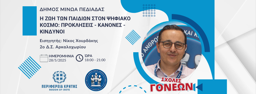 Στον Δήμο Μινώα Πεδιάδος, η συνάντηση θα επικεντρωθεί στο θέμα «Η ζωή των παιδιών στον Ψηφιακό Κόσμο: Προκλήσεις – Κανόνες – Κίνδυνοι» και θα διεξαχθεί στο 2ο Δημοτικό Σχολείο Αρκαλοχωρίου, από τις 18:00 έως τις 21:00. Εισηγητής θα είναι ο Εκπαιδευτικός Πληροφορικής και Πιστοποιημένος Εκπαιδευτής Ενηλίκων, κ. Νίκος Χουρδάκης.