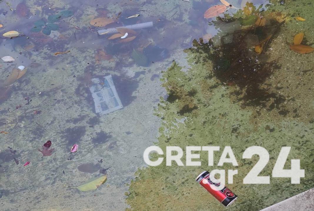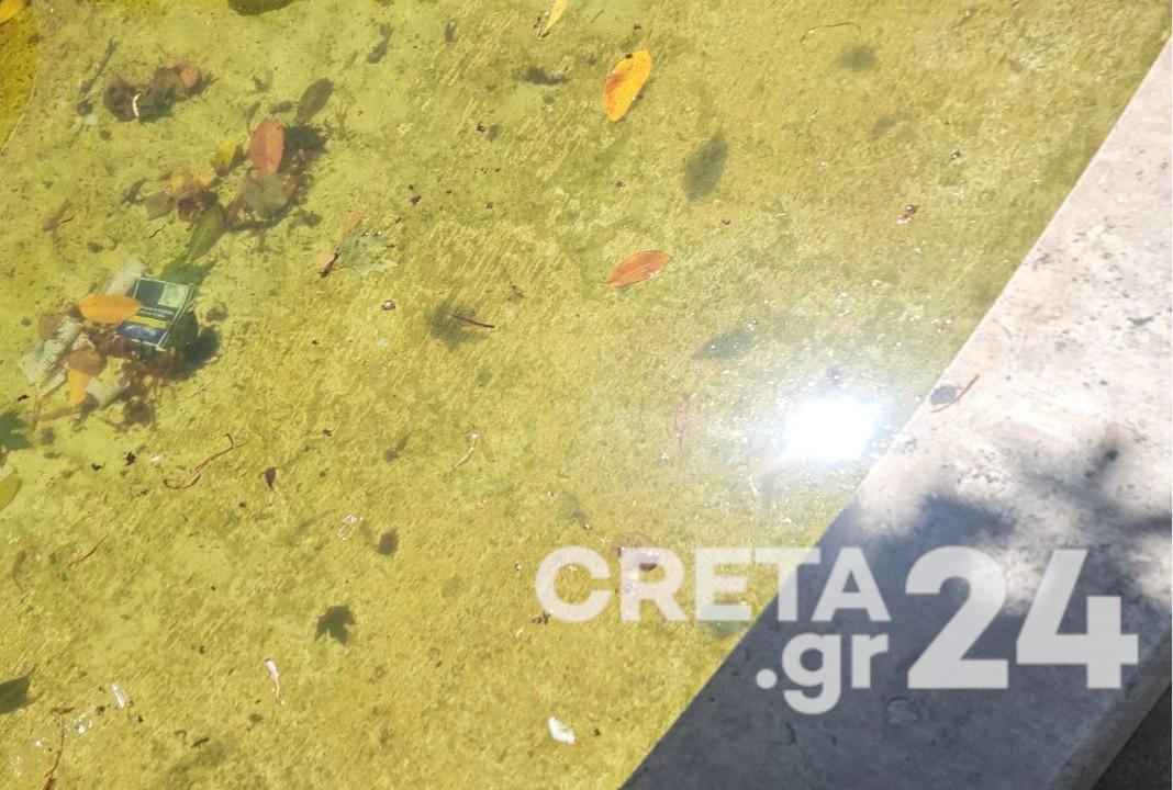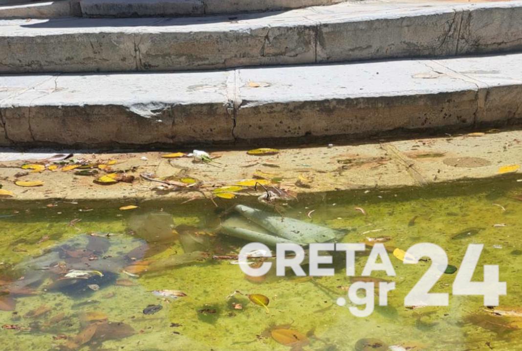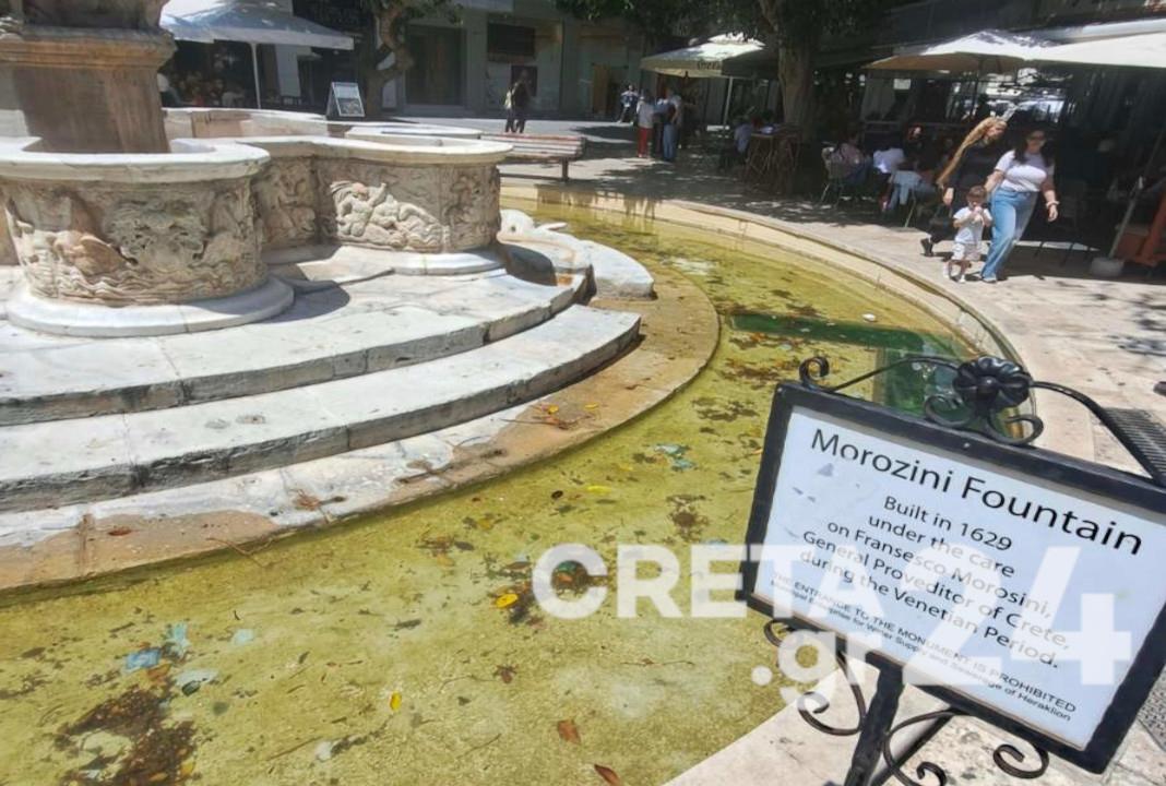 Και την ίδια στιγμή, η Κρήνη Μοροζίνι, «δεσπόζει» στο κέντρο της πόλης του Ηρακλείου, βρώμικη, με ορισμένους να την έχουν γεμίσει σκουπίδια.