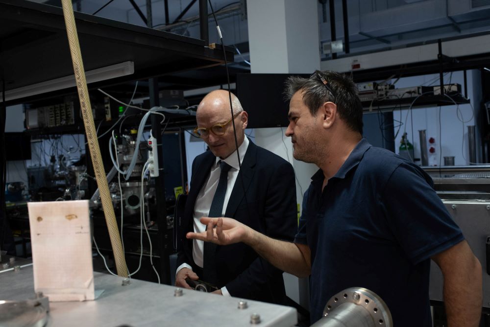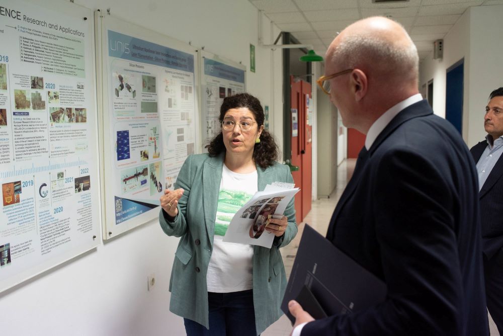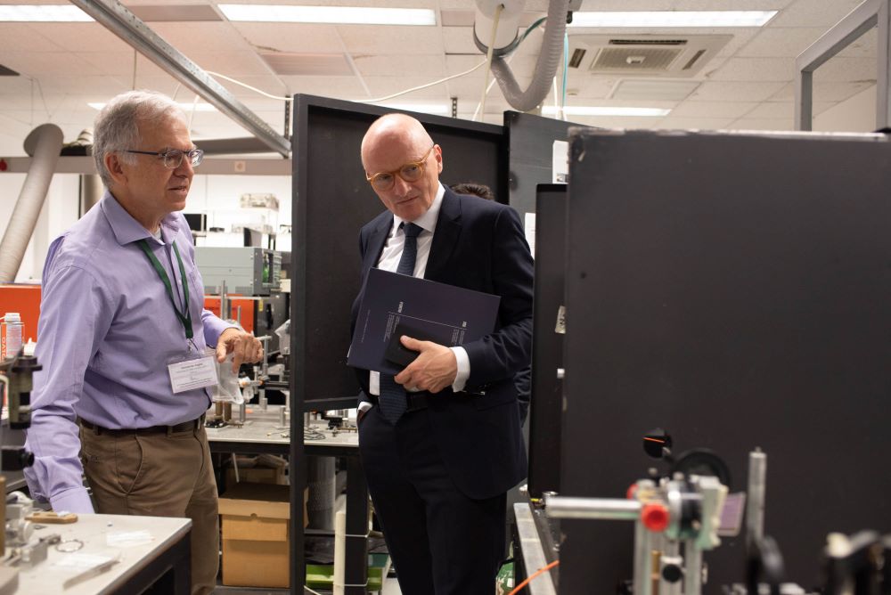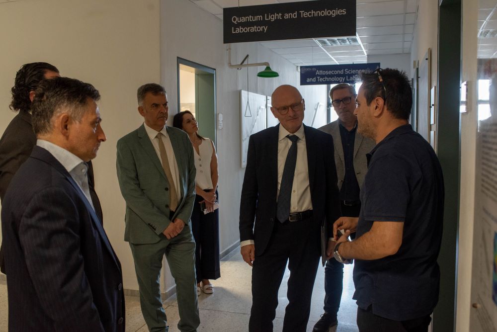 Ακολούθησε επίσκεψη σε ερευνητικά εργαστήρια του Ιδρύματος. Στο Ινστιτούτο Ηλεκτρονικής Δομής και Λέιζερ ο Πρέσβης ενημερώθηκε για την ερευνητική δραστηριότητα της ομάδας «Εφαρμογών Φωτονικής στην Πολιτισμική Κληρονομιά- PhoHS» αναφορικά με την χρήση των λέιζερ στην ανάλυση, διάγνωση και συντήρηση ιστορικών μνημείων και έργων, εστιάζοντας σε συνεργασίες της ερευνητικής ομάδας PhoHS με γερμανικούς ακαδημαϊκούς και ερευνητικούς φορείς. Επισκέφθηκε επίσης την Ομάδα Κβαντικού φωτός και τεχνολογιών, που αποτελεί ερευνητική εγκατάσταση τεχνολογίας αιχμής, όπου δόθηκε έμφαση στη σημασία των πρωτοποριακών αποτελεσμάτων του εργαστηρίου στη βασική έρευνα, στις κβαντικές τεχνολογίες αλλά και τις πιθανές εφαρμογές τους στο περιβάλλον και την βιοϊατρική απεικόνιση.