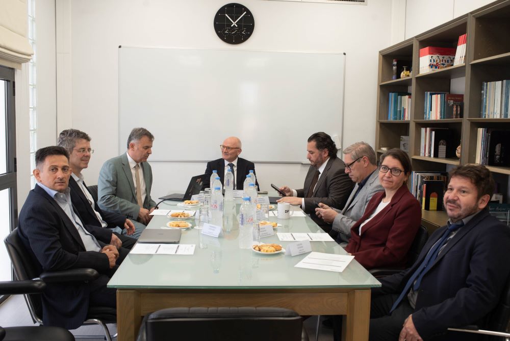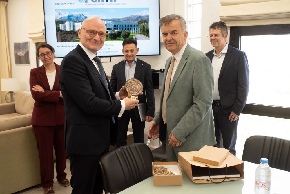 Συναντήθηκαν με τον Πρόεδρο του ΙΤΕ, καθ. Βασίλη Χαρμανδάρη, και τον Αντιπρόεδρο καθ. Δημήτρη Πλεξουσάκη, Διευθυντές των Ινστιτούτων και των Ειδικών Δομών του ΙΤΕ, και ενημερώθηκαν εκτενώς για τις δραστηριότητες του Ιδρύματος και τις πολυετείς συνεργασίες του με σημαντικά εκπαιδευτικά και ακαδημαϊκά Ιδρύματα στη Γερμανία. Χαρακτηριστικό παράδειγμα αποτελεί το Αστεροσκοπείο του Σκίνακα, κύρια ερευνητική υποδομή του Ινστιτούτου Αστροφυσικής, το οποίο ιδρύθηκε το 1984 από το ΙΤΕ, το Πανεπιστήμιο της Κρήτης και το Max-Planck Institute for Extraterrestrische Physik (MPE – Γερμανία), με το οποίο υπάρχει στενή ερευνητική συνεργασία.