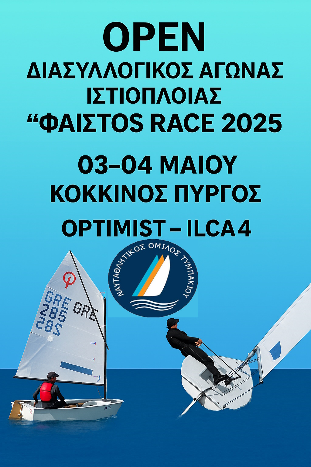 Ο Ναυταθλητικός Όμιλος Τυμπακίου (ΝΟΤ), σε συνεργασία με την Ελληνική Ιστιοπλοϊκή Ομοσπονδία και την Περιφέρεια Κρήτης, έχει την τιμή να ανακοινώσει τη διοργάνωση του Open Πανελλήνιου Διασυλλογικού Αγώνα με την επωνυμία «ΦΑΙΣΤΟΣ RACE 2025», που θα πραγματοποιηθεί στις 3 και 4 Μάϊου 2025, στη θαλάσσια περιοχή του λιμανιού του Κόκκινου Πύργου, Τυμπακίου.