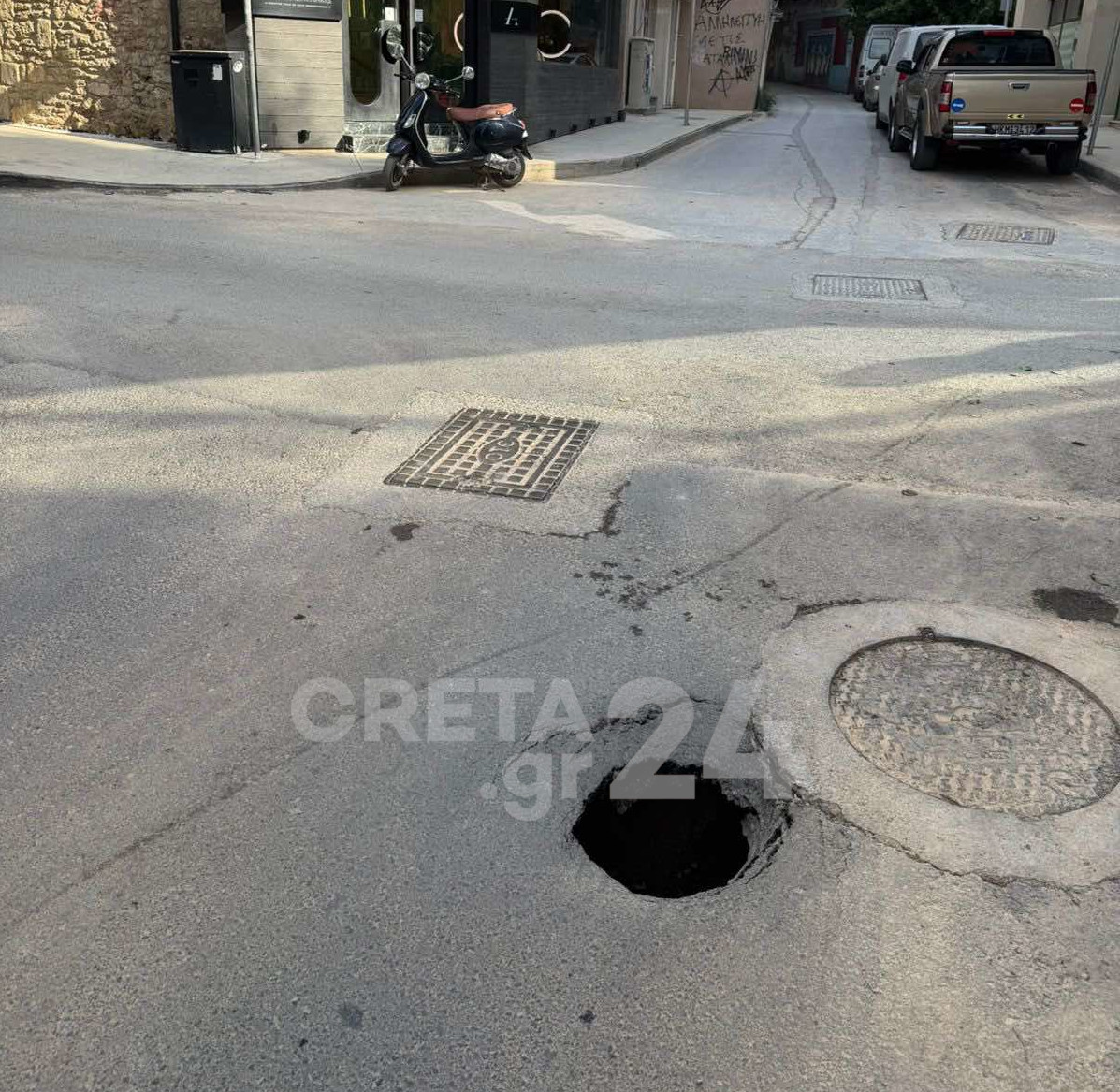 Όπως φαίνεται στις εικόνες του Creta24, το οδόστρωμα έχει υποστεί καθίζηση, με αποτέλεσμα να δημιουργηθεί η τρύπα, η οποία αποτελεί κίνδυνο για οδηγούς και πεζούς.