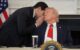 O Μάρκο Ρούμπιο πλησιάζει τον Ντόναλντ Τραμπ, κατά τη διάρκεια σύσκεψης στον Λευκό Οίκο, του παραδίδει ένα χειρόγραφο σημείωμα και του ψιθυρίζει κάτι.