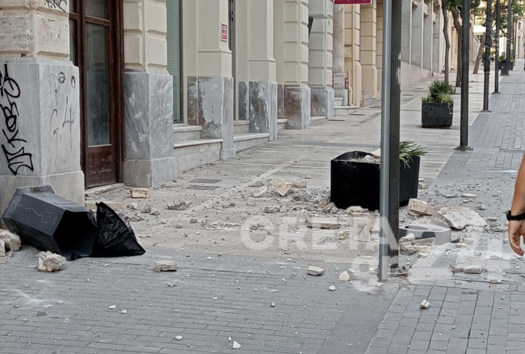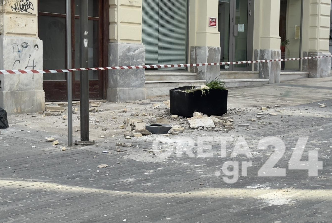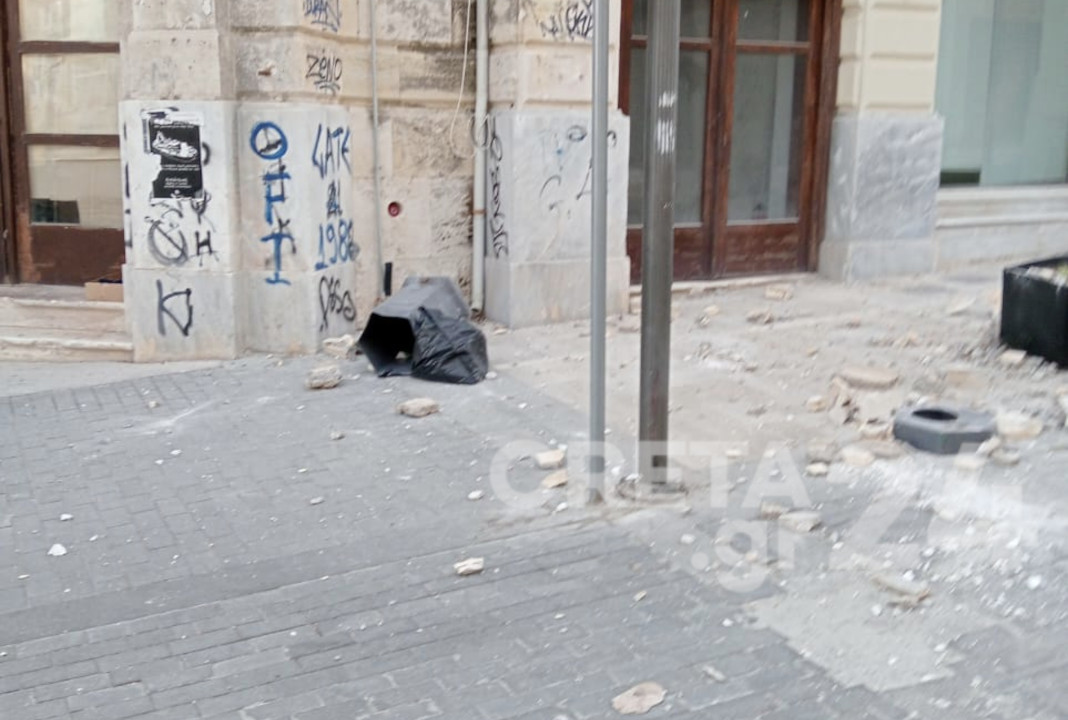 Κατέρρευσαν τμήματα κτιρίου στην 25ης Αυγούστου, λόγω του ισχυρού σεισμού που ταρακούνησε την Κρήτη το πρωί της Πέμπτης.