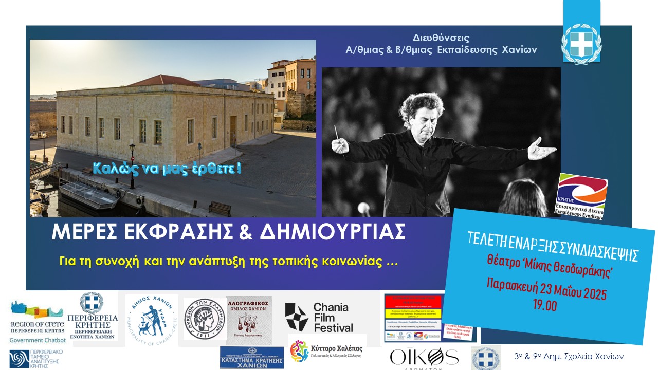 Οι Διευθύνσεις Πρωτοβάθμιας και Δευτεροβάθμιας Εκπαίδευσης Χανίων, σε συνδιοργάνωση με την Περιφέρεια Κρήτης, το Περιφερειακό Ταμείο Ανάπτυξης Κρήτης, την Περιφερειακή Ενότητα Χανίων, τον Δήμο Χανίων, το Επιστημονικό Δίκτυο Εκπαίδευσης Ενηλίκων και το Κύτταρο Χαλέπας, προσκαλούν τους εκπαιδευτικούς και τους πολίτες του τόπου να συμμετάσχουν στην εβδομαδιαία δράση: