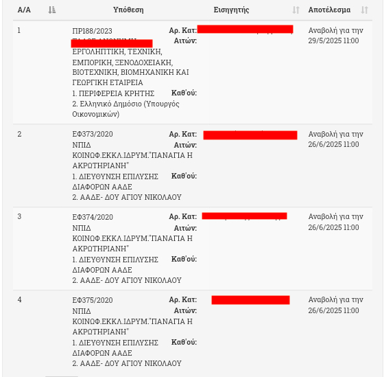 Η αρχική προσφυγή απορρίφθηκε από το Πρωτοδικείο και έγινε νέα προσφυγή– στην πραγματικότητα είναι 3 διαφορετικές υποθέσεις για το ίδιο θέμα κατά της ΑAΔΕ- οι οποίες ήδη έχουν αναβληθεί δυο φορές στο Εφετείο. Και τώρα αναβλήθηκε για… τρίτη φορά!