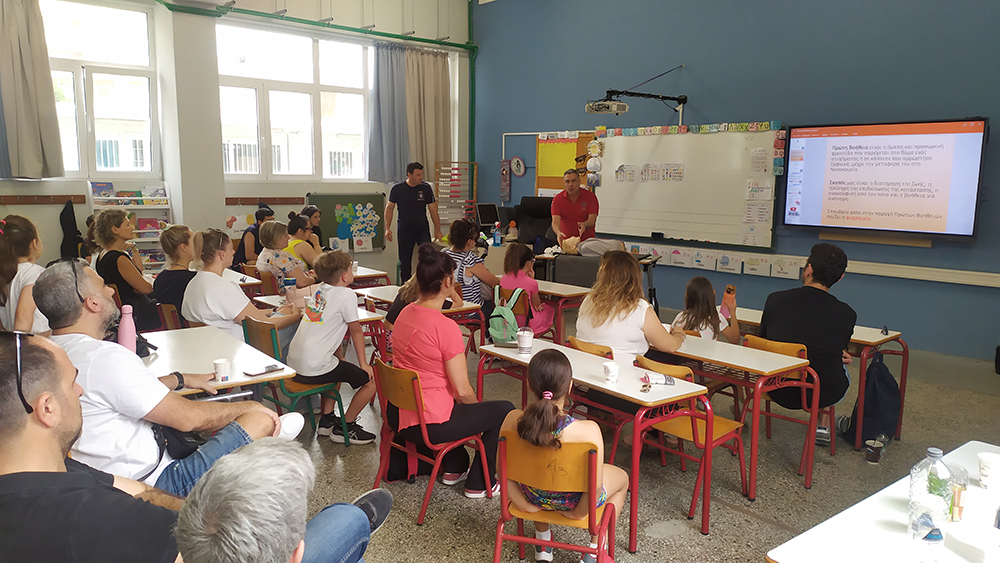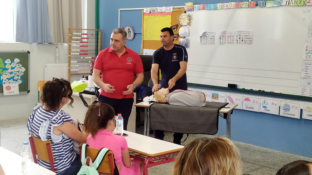 Στο δεύτερο μέρος ο διασώστης του ΕΚΑΒ Μανώλης Λεμονάκης μας έδειξε αναλυτικά τη διαδικασία καρδιοαναπνευστικής αναζωογόνησης (ΚΑΡΠΑ – CPR) αλλά και τη διαδικασία χρήσης του εξωτερικού φορητού απινιδωτή, ενώ ακολούθησε και πρακτική άσκηση όσων γονιών επιθυμούσαν να εκπαιδευτούν στις παραπάνω λειτουργίες.