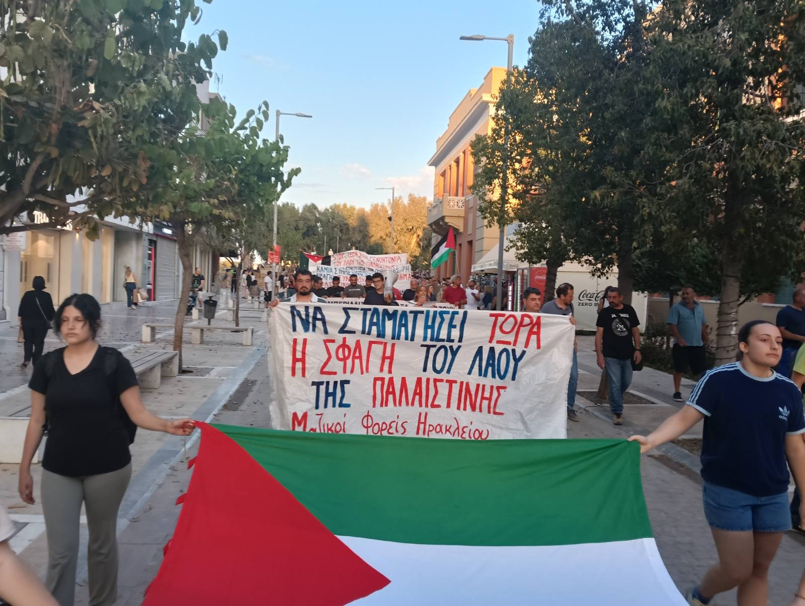 Με σύνθημα «Στης Γάζας τα συντρίμμια που σφίγγει ο κλοιός, κεφάλι θα σηκώσει ο ήρωας λαός!!» δεκάδες φορείς, εργατικά σωματεία και φοιτητικοί σύλλογοι απεύθυναν κάλεσμα αγωνιστικού ξεσηκωμού στον Ηρακλειώτικο λαό για τα συνεχή εγκλήματα του κράτους – δολοφόνου του Ισραήλ που διαπράττει σε βάρος του Παλαιστινιακού λαού.