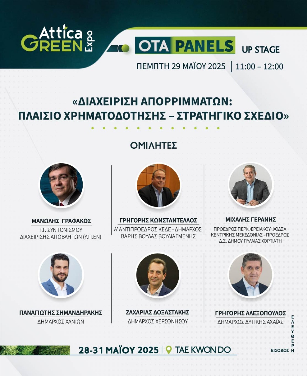 Στο panel, μεταξύ άλλων συμμετέχουν επίσης ο Αναπληρωτής Υπουργός Ανάπτυξης & Επενδύσεων, Νίκος Παπαθανάσης, ο Γενικός Γραμματέας Συντονισμού Διαχείρισης Αποβλήτων, Μανώλης Γραφάκος και ο Αντιπρόεδρος της ΚΕΔΕ, Γρηγόρης Κωνσταντέλλος.