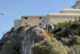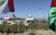 Ομάδα ατόμων βρίσκεται στην πλαγιά απέναντι από τον προβλήτα που έδεσε το κρουαζιερόπλοιο κρατώντας σημαίες και πανό.