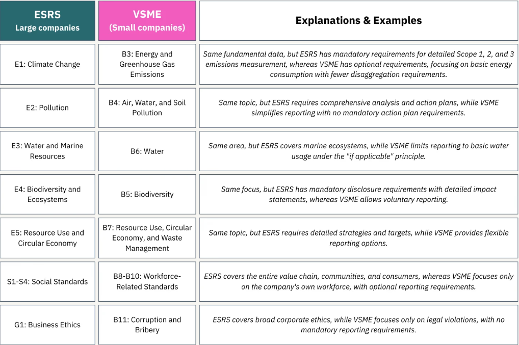 Το πρότυπο VSME είναι εννοιολογικά παρόμοιο με τα Ευρωπαϊκά Πρότυπα Αναφοράς Βιωσιμότητας (ESRS), αλλά χρησιμοποιεί απλοποιημένη γλώσσα και μια αρθρωτή προσέγγιση, δημιουργώντας ένα συνεκτικό και φιλικό προς το χρήστη πλαίσιο.