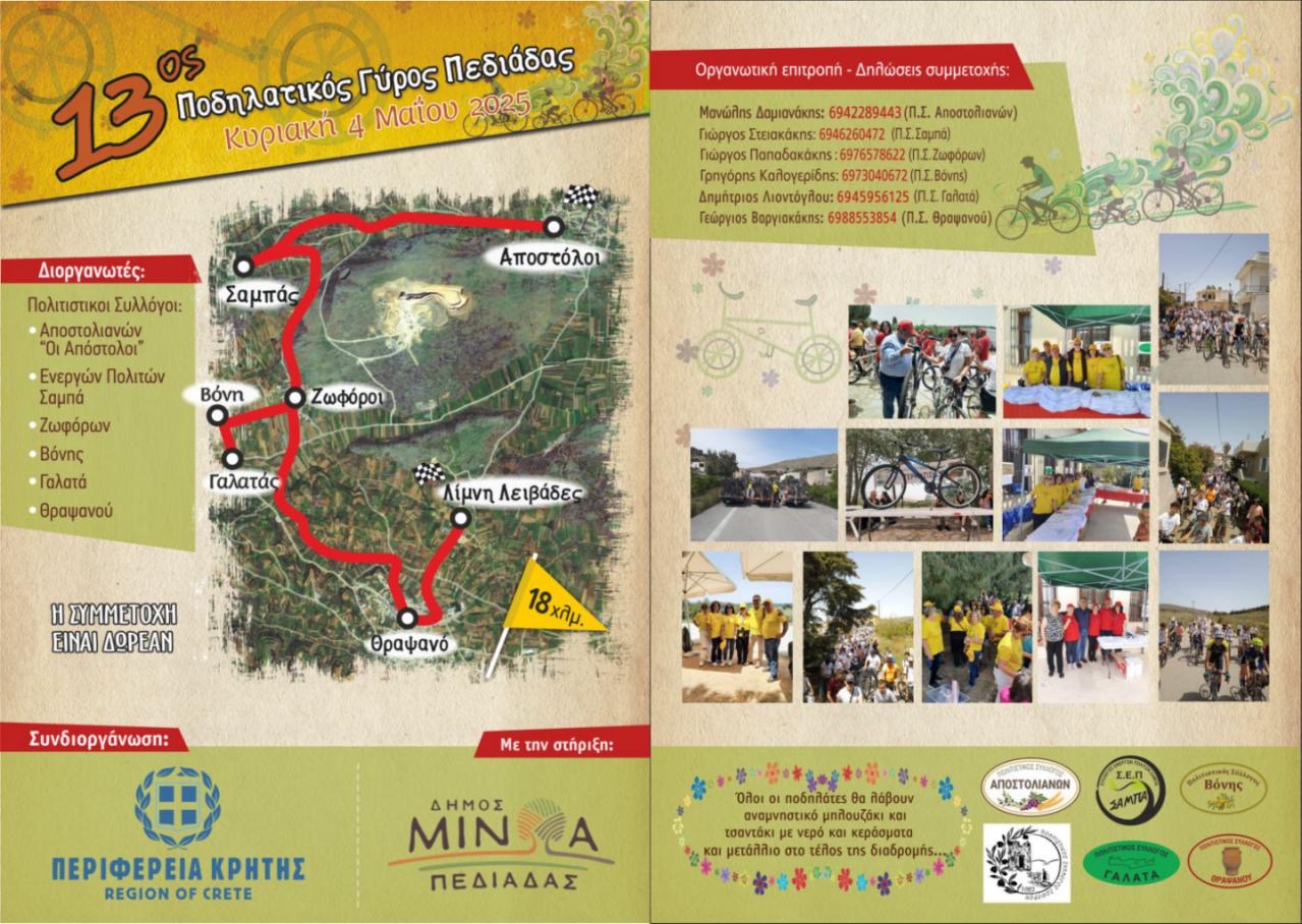 Στις 4 Μαΐου 2025, ημέρα Κυριακή και ώρα 11:00 θα πραγματοποιηθεί ο Ποδηλατικός Γύρος Πεδιάδος, για 13η χρονιά όπως έχει καθιερωθεί.