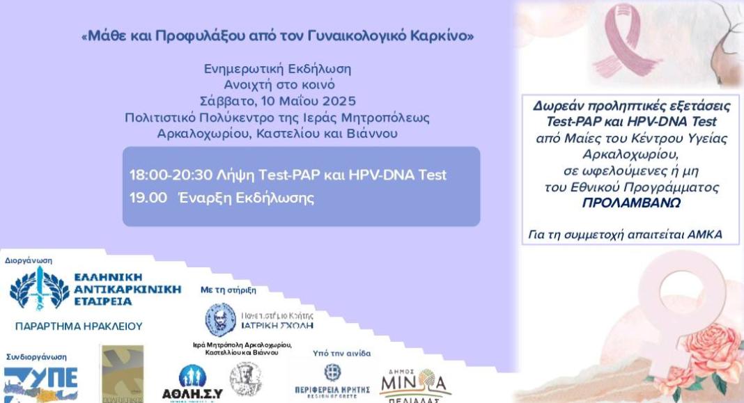 Μία πολύ σημαντική επιστημονική, ενημερωτική εκδήλωση για τον γυναικολογικό καρκίνο, θα πραγματοποιηθεί το Σάββατο 10 Μαΐου 2025, στις 7 το απόγευμα, στο Πολιτιστικό Πολύκεντρο της Ιεράς Μητροπόλεως Αρκαλοχωρίου, Καστελλίου και Βιάννου.