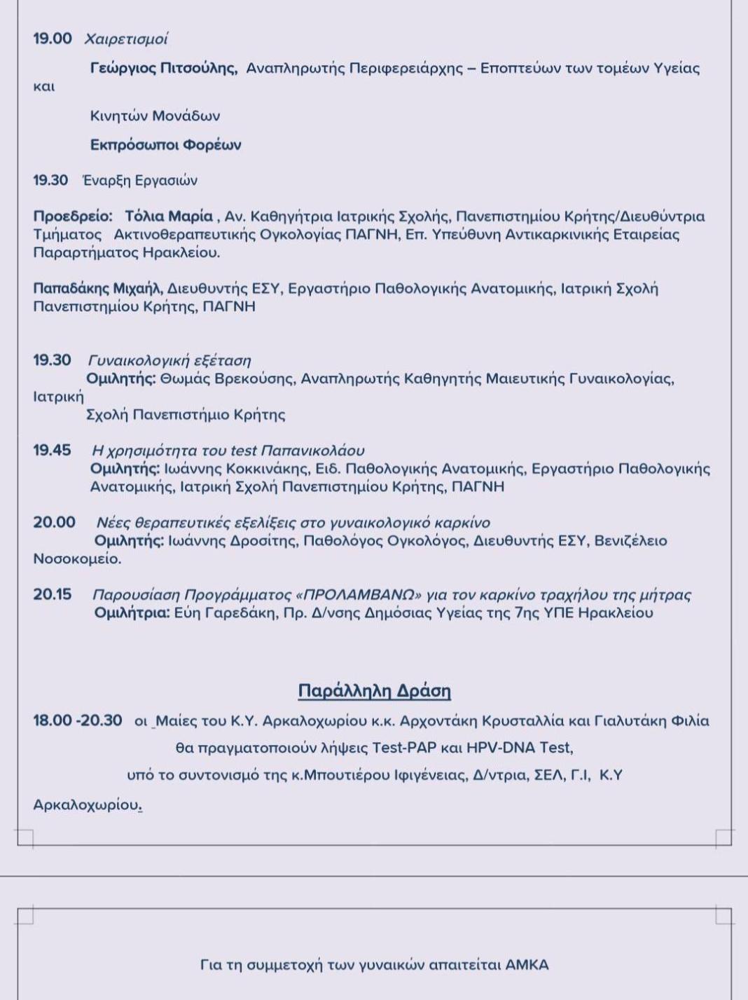 Η εσπερίδα θα είναι ανοιχτή για το κοινό ενώ εκτός από τις πολύ σημαντικές ομιλίες θα πραγματοποιηθεί και παράλληλη δράση από τις 6 έως τις 8:30 μ.μ. κατά τη διάρκεια της οποίας, οι Μαίες του Κ.Υ. Αρκαλοχωρίου Κρυσταλλία Αρχοντάκη και Φιλία Γιαλυτάκη, θα πραγματοποιούν λήψεις Τest-PAP και ΗPV-DNA Test, υπό το συντονισμό της Διευθύντριας του Κέντρου Υγείας Αρκαλοχωρίου Ιφιγένειας Μπουτιέρου.