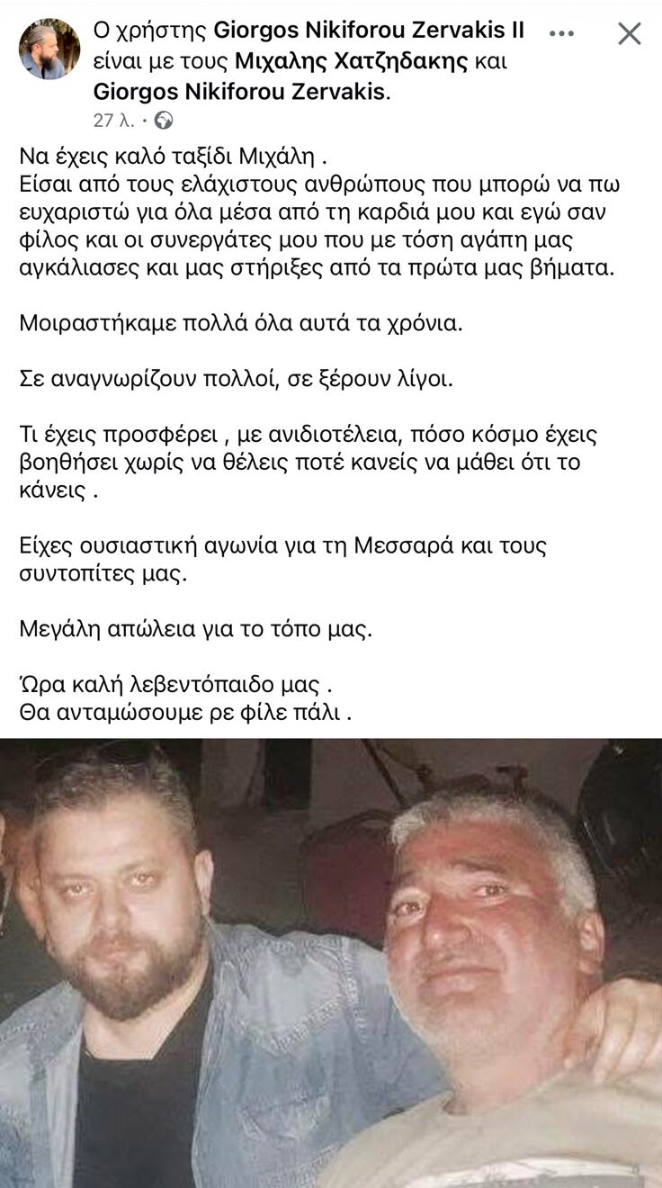 «Είσαι από τους ελάχιστους ανθρώπους που μπορώ να πω ευχαριστώ για όλα μέσα από τη καρδιά μου και εγώ σαν φίλος και οι συνεργάτες μου που με τόση αγάπη μας αγκάλιασες και μας στήριξες από τα πρώτα μας βήματα», αναφέρει ο Γιώργος Νικηφόρου Ζερβάκης στον αποχαιρετισμό του στον καλό του φίλο που «έσβησε» στο τροχαίο που σημειώθηκε τα ξημερώματα της Δευτέρας, στο δρόμο προς Γαλιά.