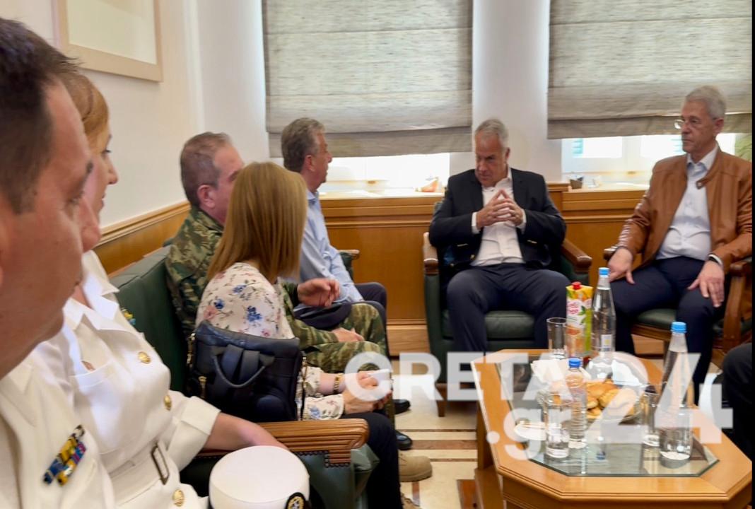 Στη συνάντηση μετείχαν η Γραμματέας της Αποκεντρωμένης Διοίκησης Κρήτης Μαρία Κοζυράκη, ο Αντιπεριφερειάρχης Ηρακλείου Νίκος Συριγωνάκης, υψηλόβαθμα στελέχη του Λιμενικού Σώματος, του Στρατού και εμπλεκομένων υπηρεσιών.